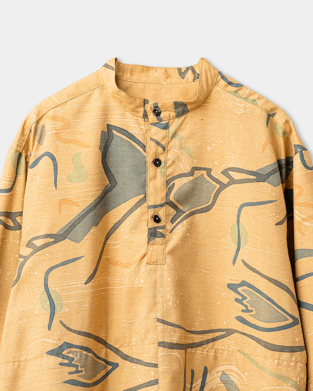 ちへいコレクションより、踊るように模様の描かれたプルオーバーシャツ。紬の生地には少しハリがあり、比較的ライトな着心地のクラフト感あるシャツに再構築しました。