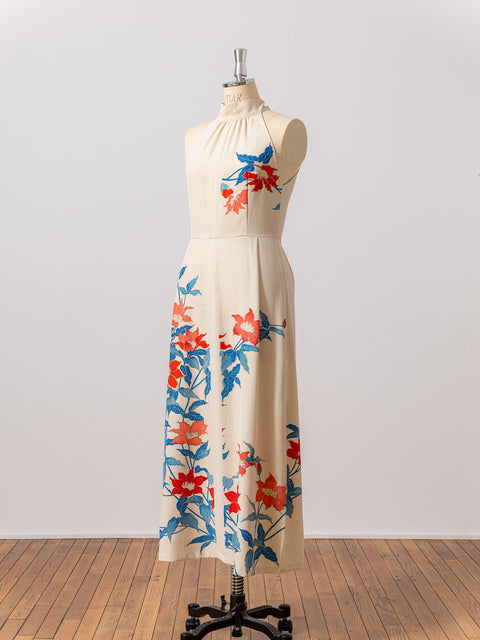 クラシカルな王道のホルターネックドレスを、着物地が最大限に活かされるように再構築したシック&エレガントな着物ドレス。美しく咲くヤマユリのように主役となるドレスです。 華やかさと洗練さのバランスを考慮したデザインで、スカートラインは、すっきりとしたシルエットながら、スリットを入れることで歩きやすさが考慮されています。オプションのマルチフリルベルトでウエストマークすればよりフェミニンな印象に。