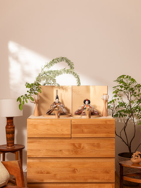 【と - きなりの更紗、茶に白桜】の5点・ひな飾り
