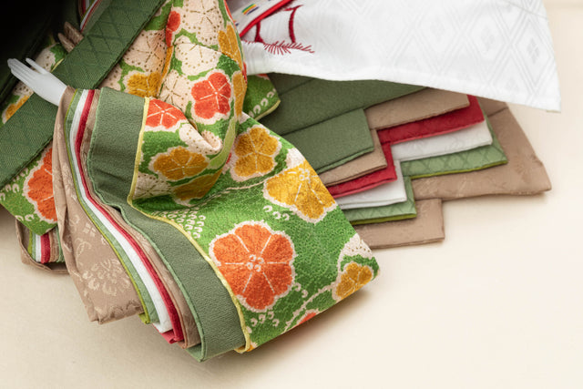 唐衣(1枚目の生地)に描かれた花々が引き立つような重ねにしました。個性と品のある色合いで、華やかな佇まいに。