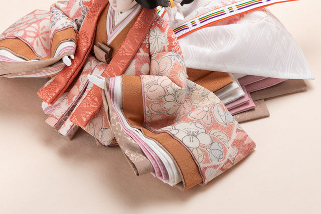 柔らかくたおやかな色彩。お姫さま、お殿さまのお衣装は共に、陽春のように明るくも、しっとりとした奥深さのあるお着物です。あたたかな春を迎えて、成長する喜び表現し、心穏やかで素直な子に育って欲しいという願いが込められています。