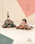 色彩豊かな梅の花と戯れる花鳥が描かれた唐衣(1枚目のお着物)に、優しくも味わいある翠を重ねました。襟元には桃色を添え、春の彩りを纏う姫に仕上がりました。