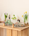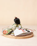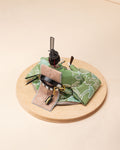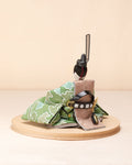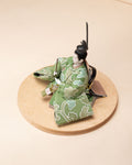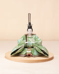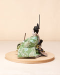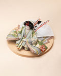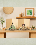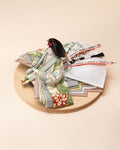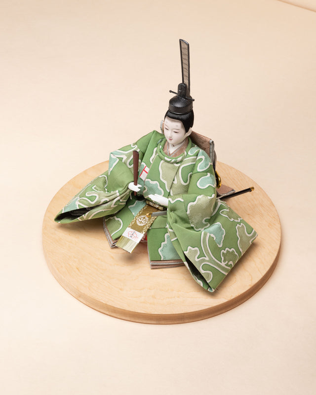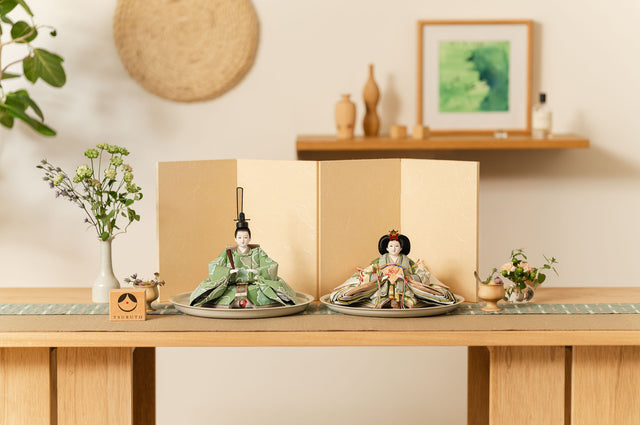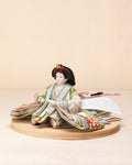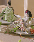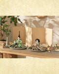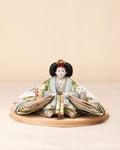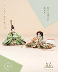 清流のような雰囲気を持ち、また生き生きとした若葉を思わせる色彩をまとった「お - 秘色と緑彩の花唐草」のお雛さま。清らかで明るく、活気に満ち溢れた子に育って欲しいという願いが込められいます。