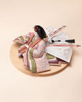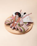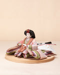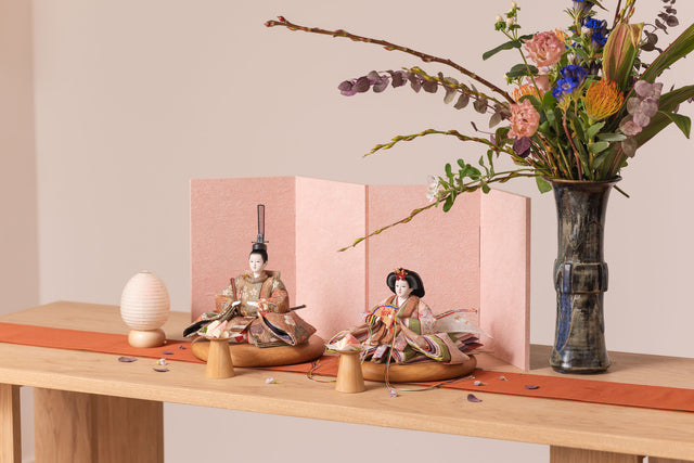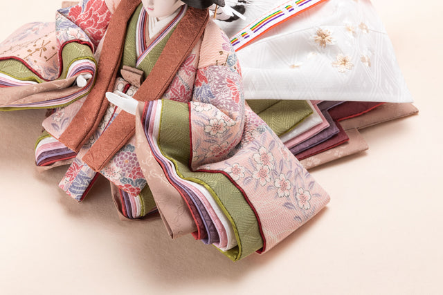 やさしく深みのある桃色に、春に芽吹く枝葉を表現し、若草色を重ねました。「桃」「緑」「白」の桃の節句の配色をベースとしながら、紫や蘇芳色を重ね、重厚感のある彩り溢れる十二単のお衣装となりました。
