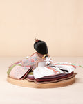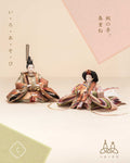 お姫さまとお殿さま、共にやわらかく落ち着きのある春の色彩が表現されています。別々の職人の手から生まれたお着物だったにも関わらず、2つの衣装に調和した世界が生まれました。心穏やかで調和していく良縁と幸福に恵まれますようにという願いが込められています。