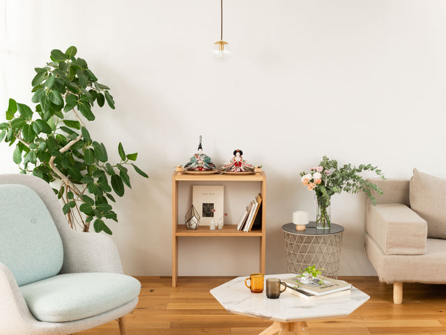 素材は、オークとタモを使用。ナチュラルな木の質感で、お部屋に馴染みやすく、お雛さまを飾る以外にもディスプレイ用の棚としてお使いいただけます。