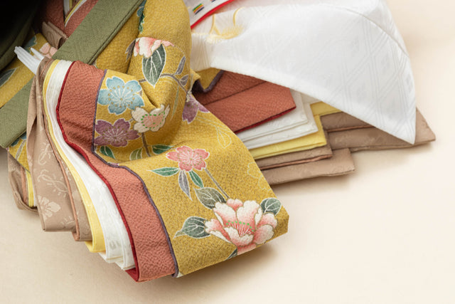 桜や牡丹、菊などが咲く唐衣(1枚目の生地)に、長春色の裾表(2枚目の生地)を重ねました。抹茶色の襟には、紗綾形の地模様を入り、華やかで古典的な春の佇まいに。