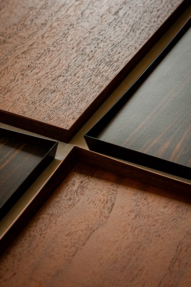 多様な木を用いた異なる形のお盆。それが、私たちが初めて見た當眞さんの作品でした。木の個性ある色や杢が、端正かつきめ細かい手仕事により、美しさとしても物としても長く使うことができる、そんなクラフト的お盆へ昇華していました。